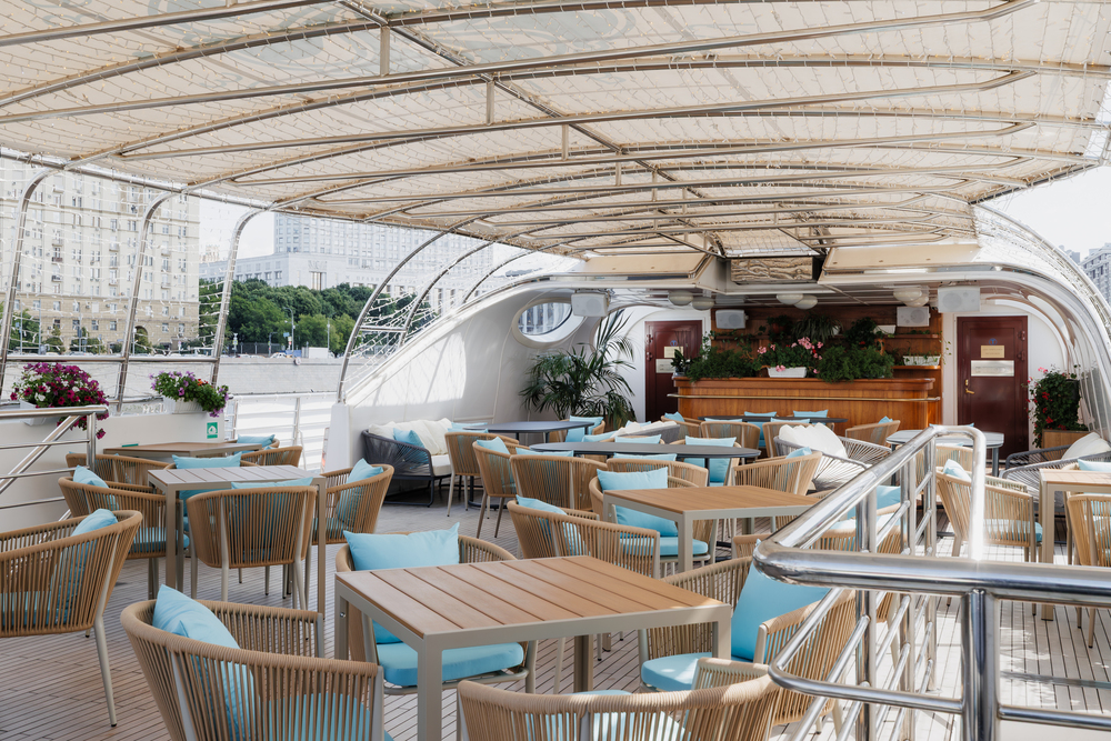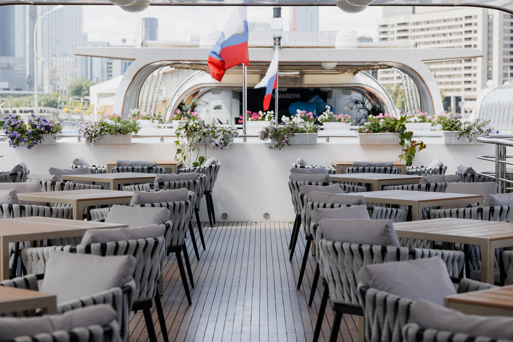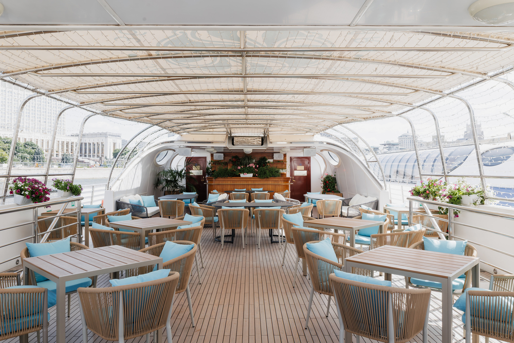 Открытая палуба – площадка с удобными столиками и стульями в передней части корабля.