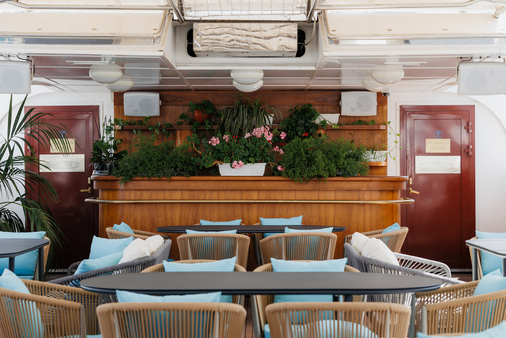 Открытая палуба – площадка с удобными столиками и стульями в передней части корабля, где можно удобно расположиться с бокалом охлаждающего напитка.